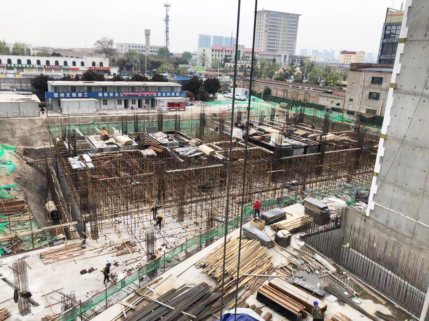 4#樓:地下室負一層框架柱鋼筋綁扎及部分頂板模板支設正在施工。