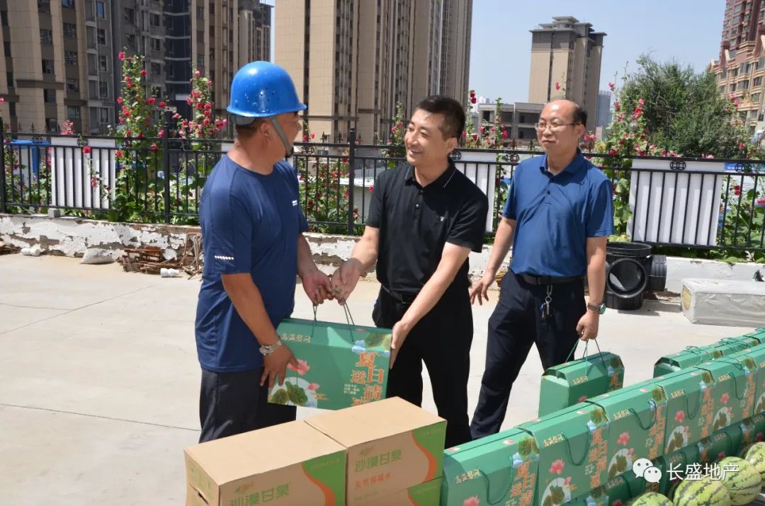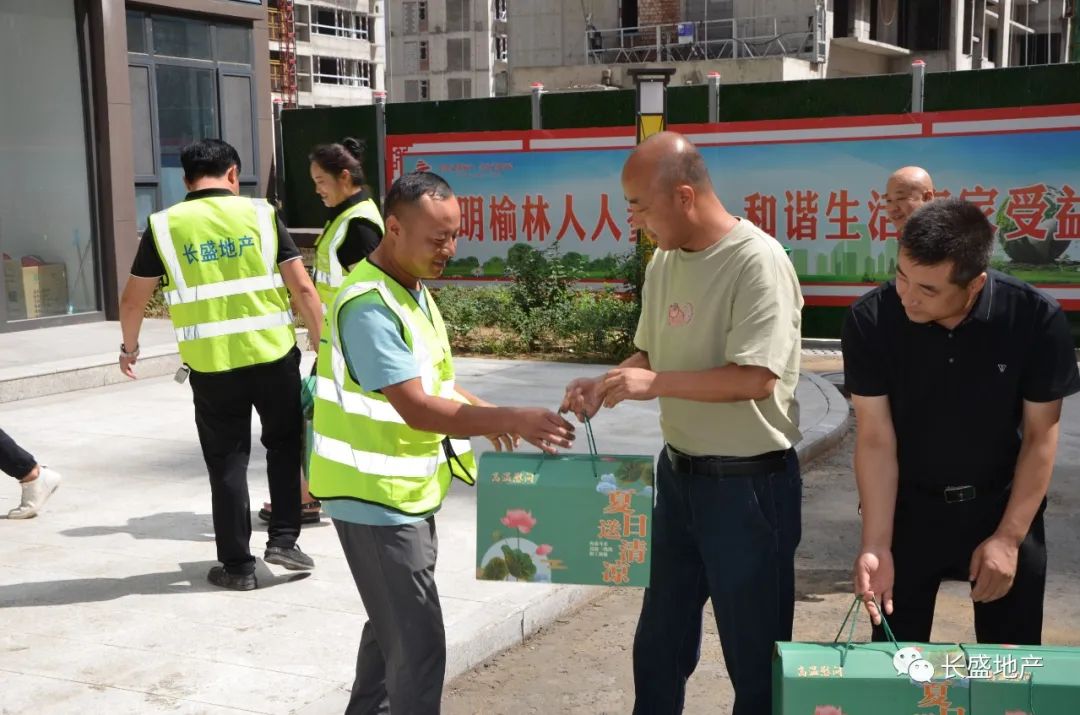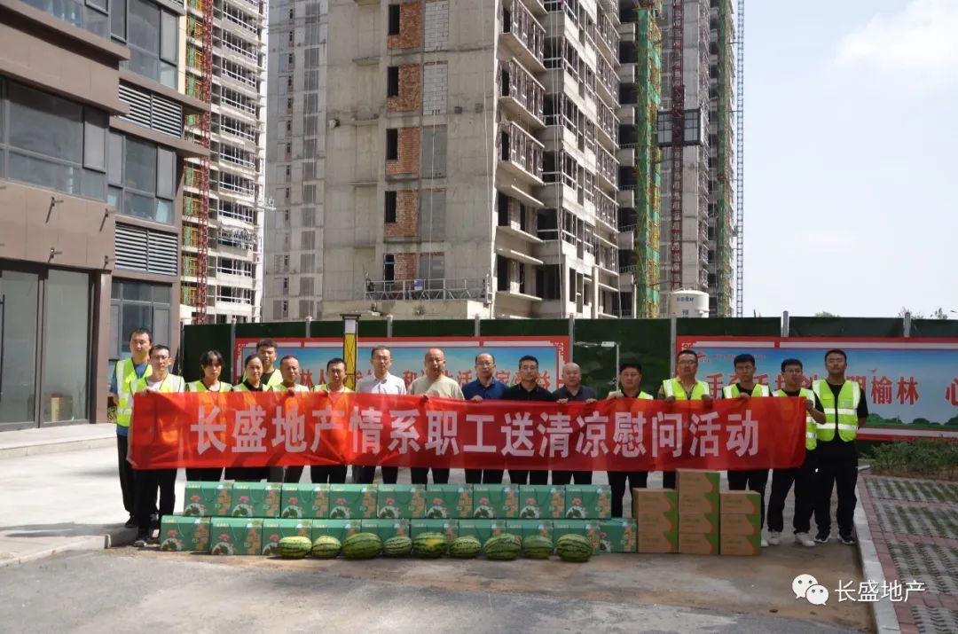 7月13日,榆林市長盛集團房地產開發有限公司開展2022年度“情系職工送清涼”慰問活動,看望慰問榆林區內在建項目一線員工,為他們送去小米、綠豆、白糖、西瓜等防暑降溫物品。