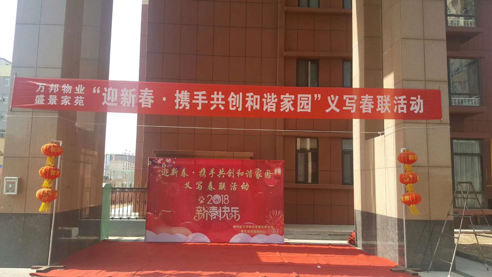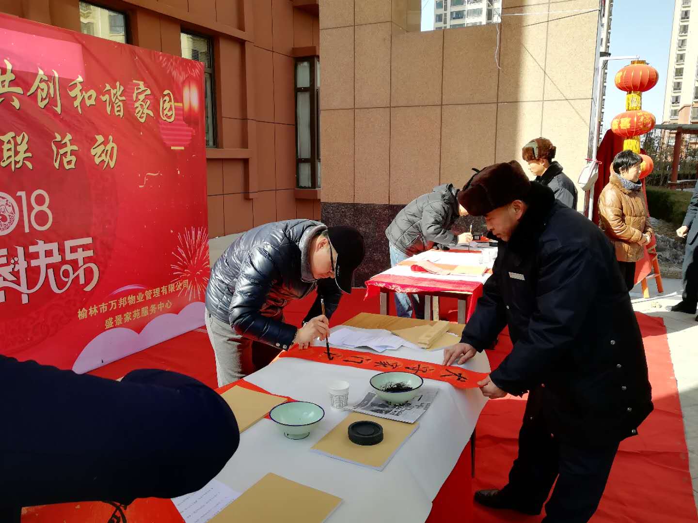 公司為喜迎新春,營造歡樂和諧的春節節日氛圍,同時增進業主的鄰里關系,進一步弘揚傳統文化,榆林市萬邦物業管理有限公司于2018年2月8日舉辦了盛景家苑小區“迎新春·攜手共創和諧家園”義寫春聯活動。