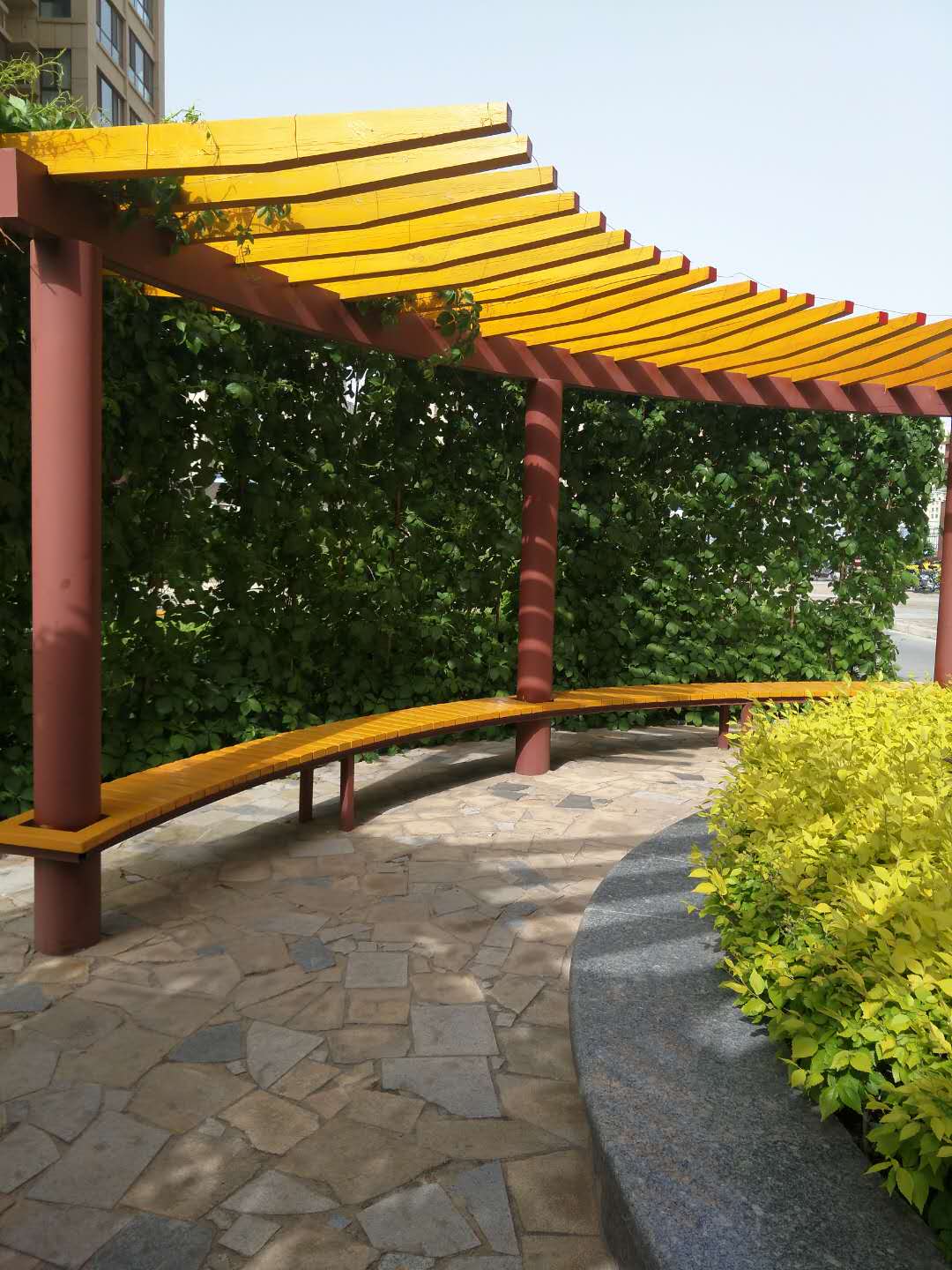 室外條形座椅以及南門涼亭涂刷橘黃色油漆,使人心情愉悅、放松,搭配上郁郁蔥蔥的爬山虎,為業主夏季納涼提供了一個好去處。