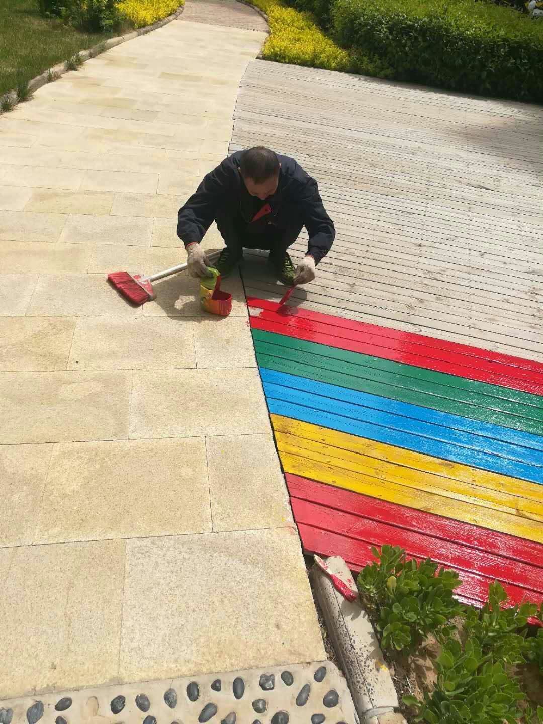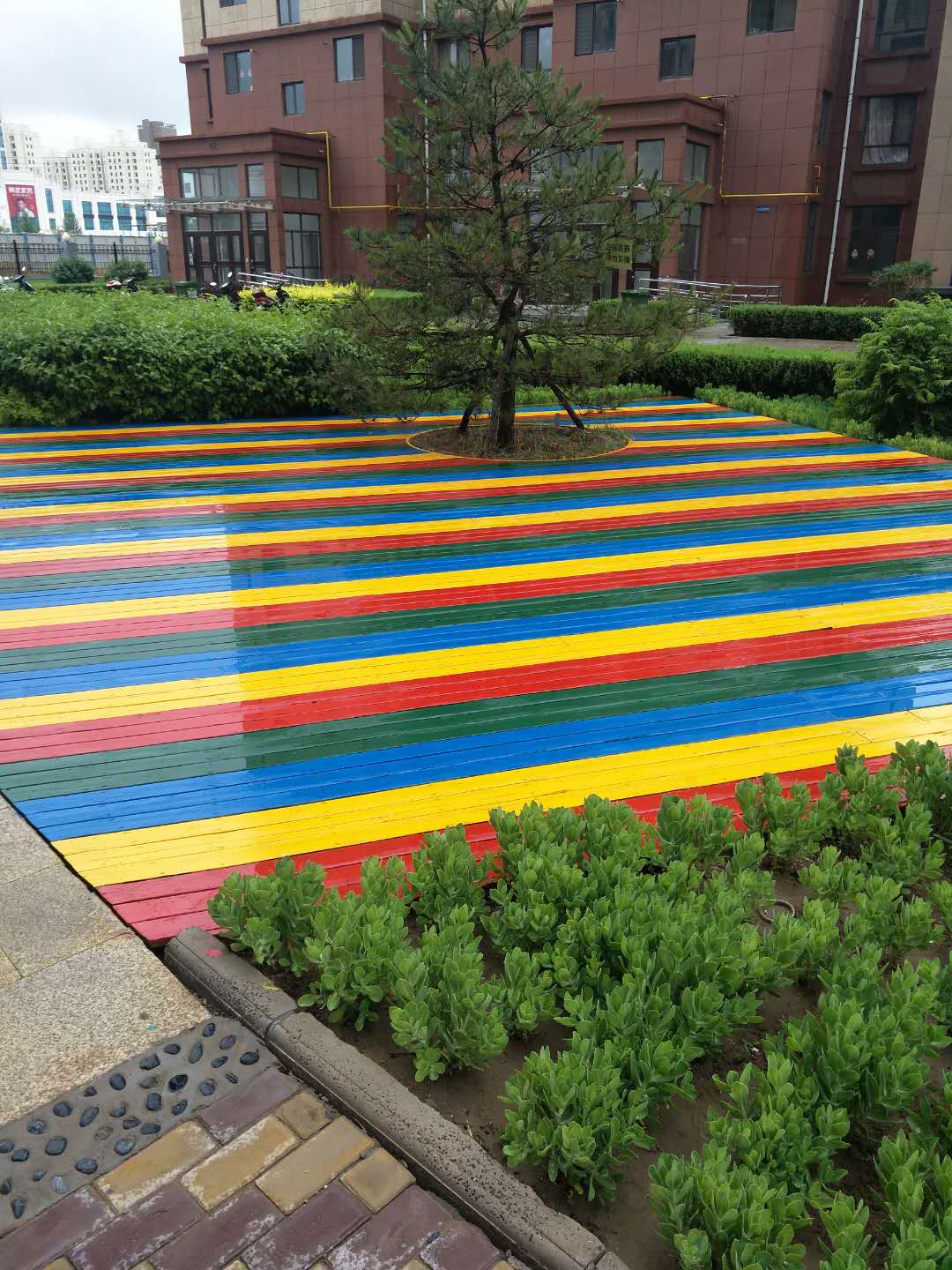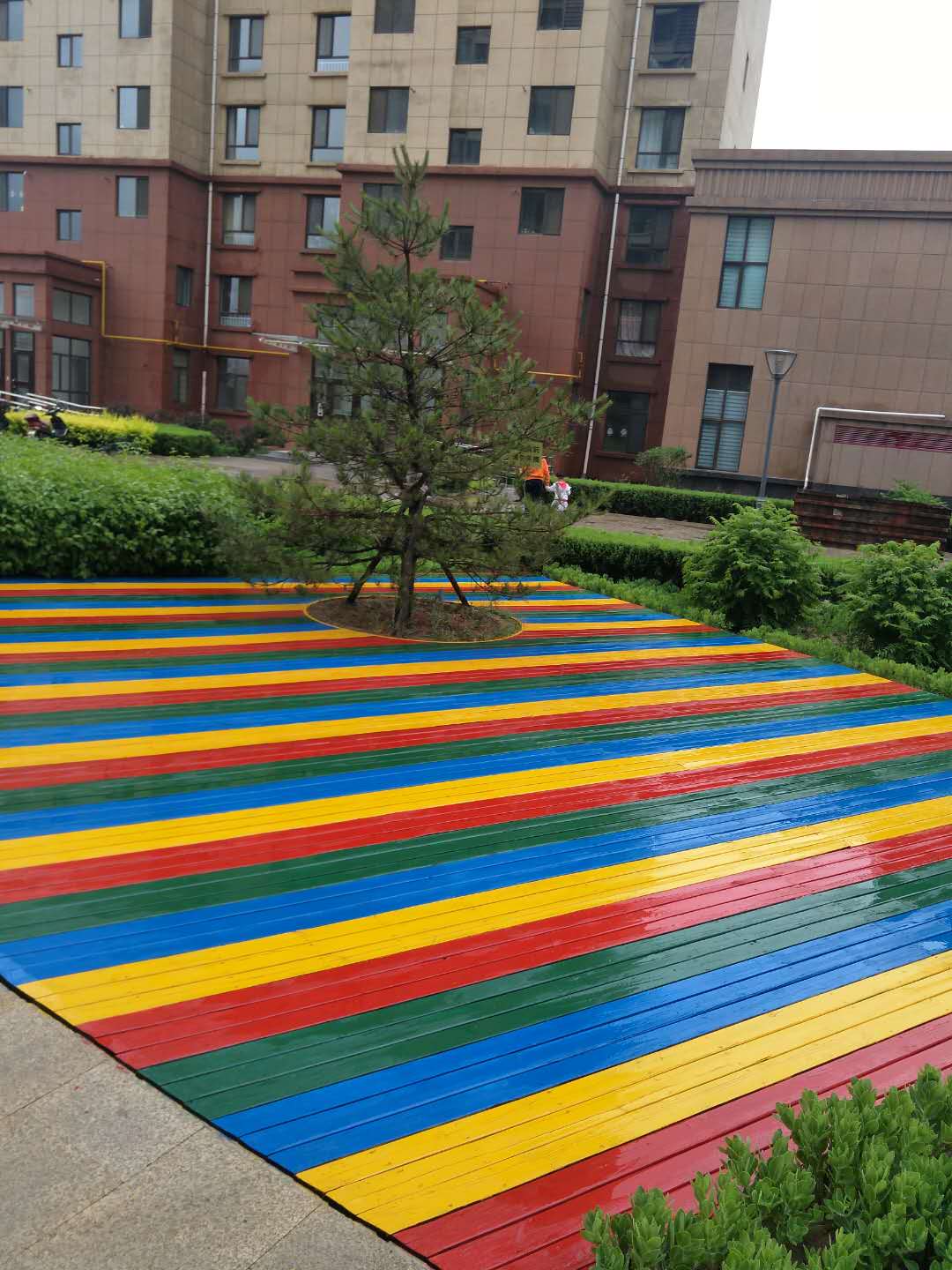 6號樓后面木質場地活動區域涂出彩虹色線條,為兒童創建了一個新“游樂場”。