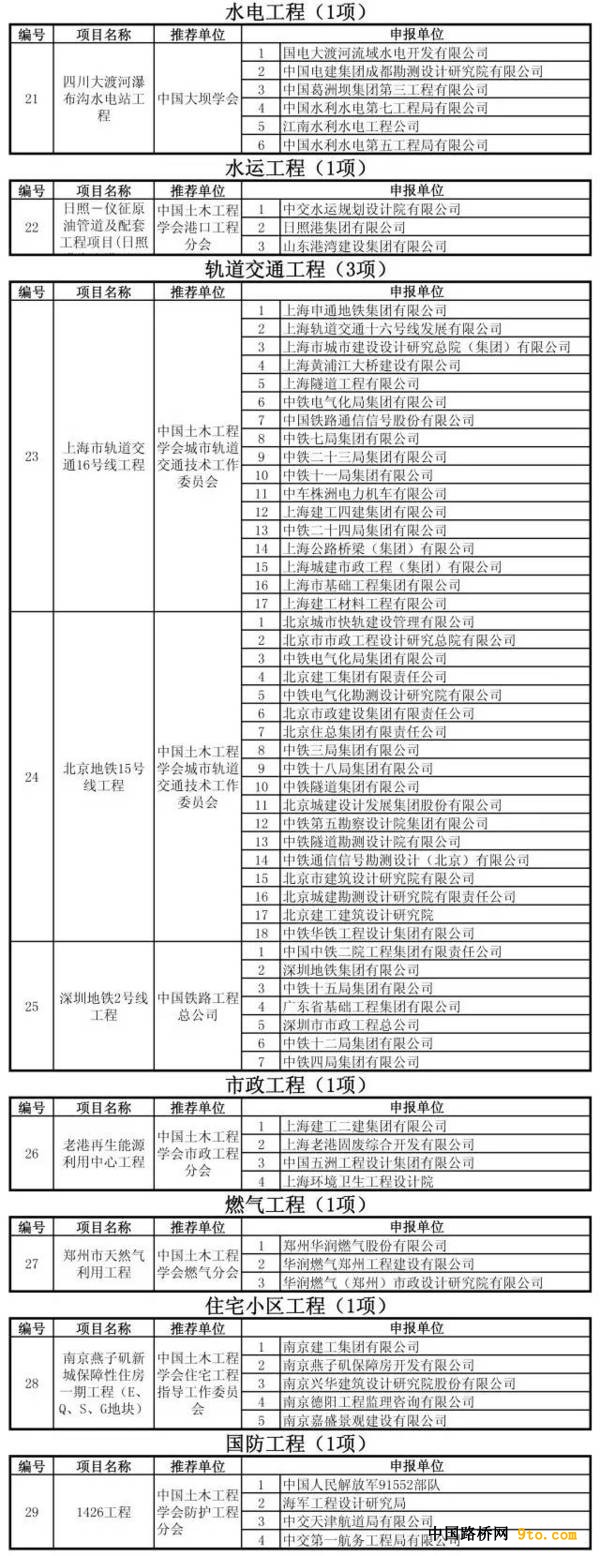 第十四屆中國土木工程詹天佑獎總共有29項工程項目獲獎,其中建筑工程9項,橋梁工程4項,鐵道和隧道工程各2項,公路工程3項,水利水電和水運工程各1項,軌道交通工程3項,市政工程、燃氣工程、住宅小區和國防工程各1項。