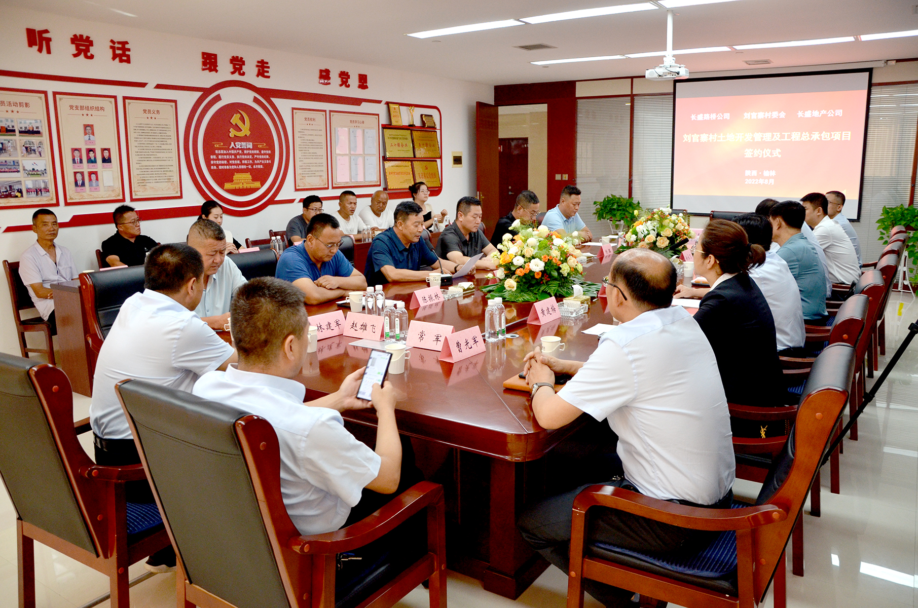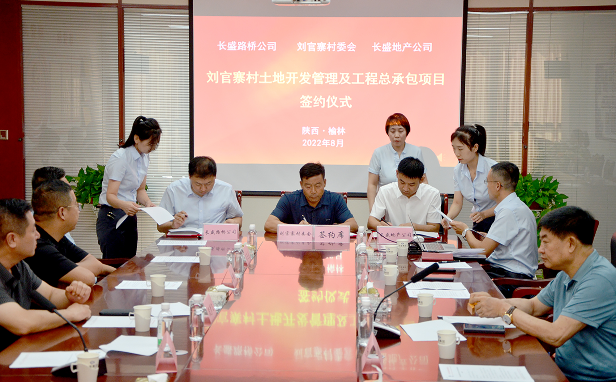 8月3日下午,榆林市長盛集團路橋工程建設有限公司、榆林市長盛集團房地產開發有限公司與榆林市榆陽區朝陽路街道劉官寨村村民委員會舉行“土地開發管理及工程總承包”協議簽約儀式。長盛集團董事長徐團林、董事長助理黨世明、總經理徐永飛、副總經理黃建梅、副總經理徐遼飛;榆陽區朝陽路街道辦事處主任段彥飛、司法所所長楊璐;劉官寨村村民委員會書記陳忠華、副主任陳振林、副書記高玉龍、監委會主任林建軍、婦女主任王換秀、村兩委會成員代表和公司部分管理人員出席了簽約儀式。